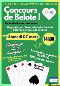 L’Association des Parents d’Élèves de l’école de Fresnes vous invite à son concours de belote (individuel sans annonces) qui aura lieu :